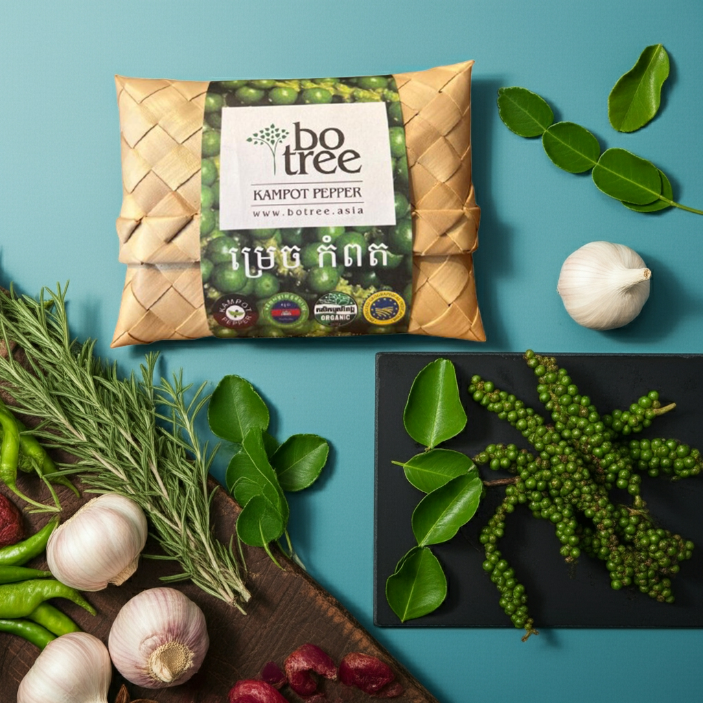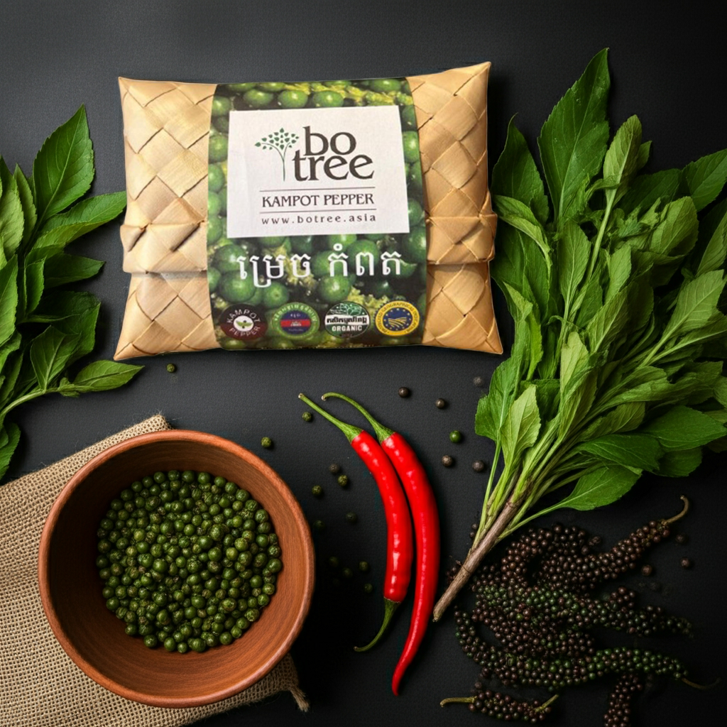 Grüner Kampot Pepper - 50g original BoTree Pfeffer, jede Palmenblätter Geschenk-Verpackung beinhaltet 1 x 50g Päckchen vakuumiert.